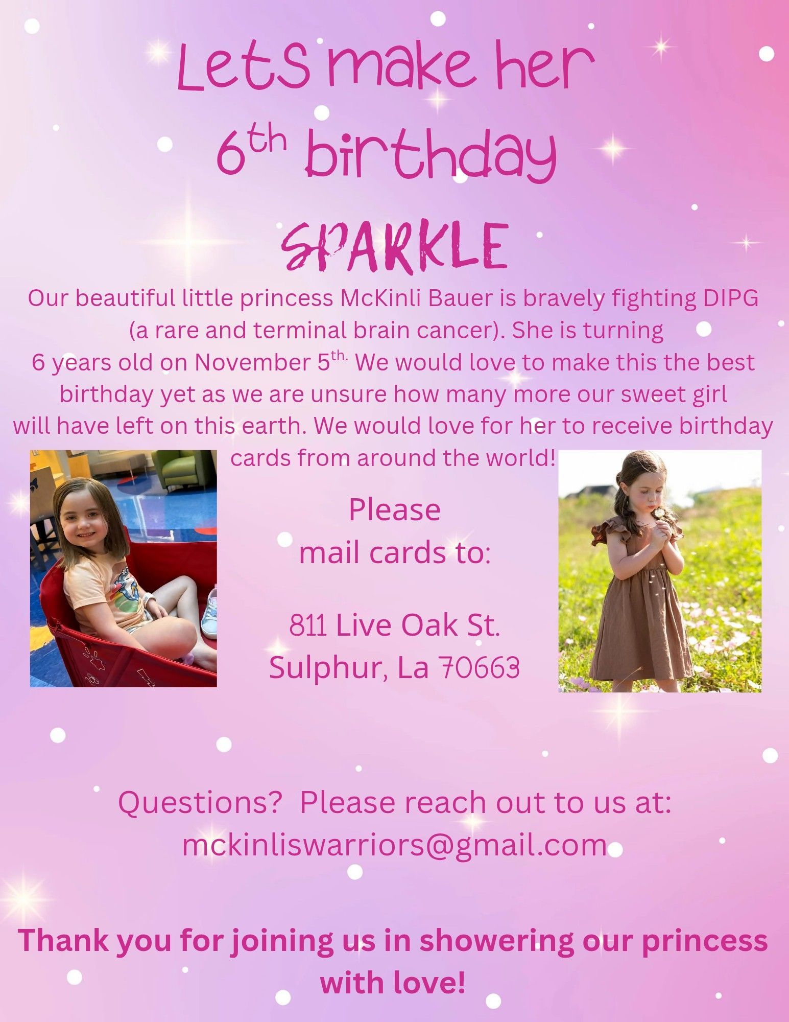 Please join us for a fun night of singing and laughing while supporting McKinli Bauer a beautiful 5 year old little girl who was sadly recently diagnosed with DIPG (a rare and terminal brain cancer). Sadly with travel, if she gets into a clinical trial there will be lots of expenses coming up including plane fare as well as expenses at home while mom is with her. We would love to help ease her parents mind by helping just a little with money so they can focus more on spending this time with their sweet baby! Any and ALL proceeds will go directly to McKinlis parents. Please check out our Facebook page (updates and Prayers for McKinli Bauer) for more information on her or reach out to us by email at